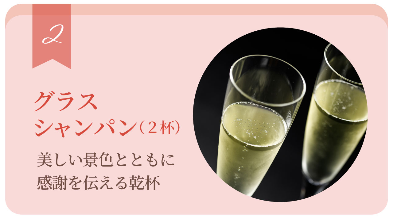 ※2名様以上でご利用の場合もプランに含まれるシャンパンは2杯です。シャンパンのみの追加は単品価格(1グラス/¥2,300)にて承ります